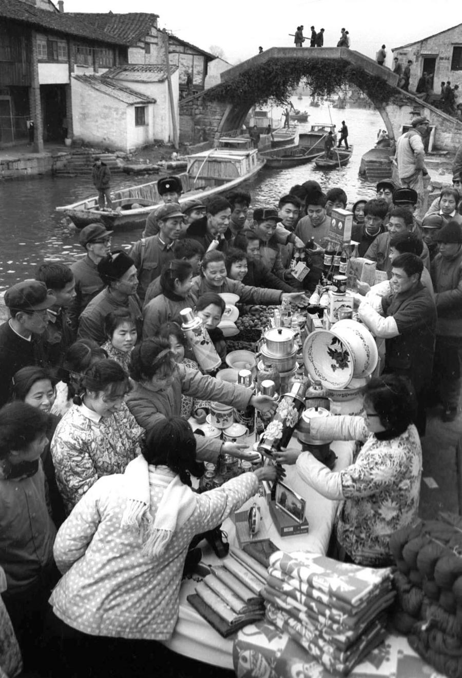 1980年,浙江紹興柯橋農(nóng)民在購(gòu)買(mǎi)年貨。 新華社發(fā)