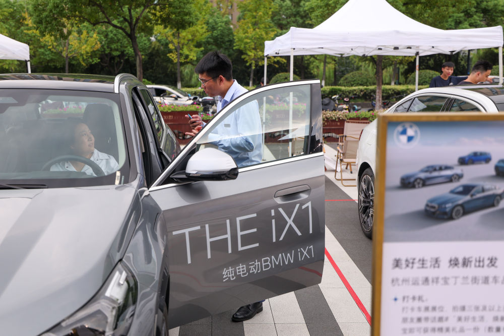 9月27日,經(jīng)銷商(右)在“美好生活 煥新出發(fā)”消費(fèi)品以舊換新展會現(xiàn)場向消費(fèi)者介紹車輛。(新華社記者 江漢 攝)