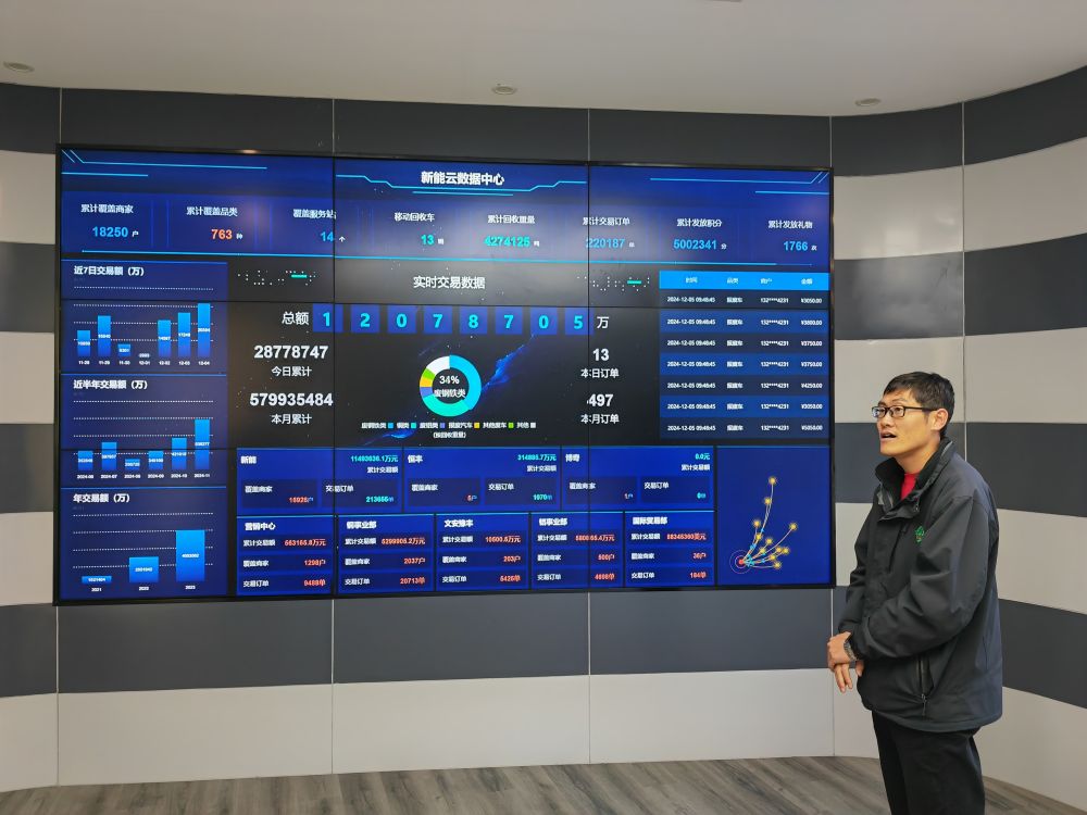 在子牙經(jīng)開區(qū)的“新能云數(shù)據(jù)中心”,巨大電子屏幕上實時顯示著新能公司與全國資源回收下游企業(yè)在銅、鋁等方面的訂單。目前,平臺線上交易商家已達18000余戶,輻射全國80%地區(qū),近3年累計回收各類再生資源400多萬噸,線上交易額近千億元。