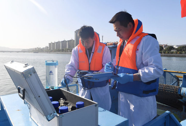 在丹江口庫區(qū)河南淅川縣鸛河流域城區(qū)段,南陽市生態(tài)環(huán)境局淅川分局工作人員記錄采樣水質(zhì)情況(2024年11月28日攝)。新華社記者 郝源 攝