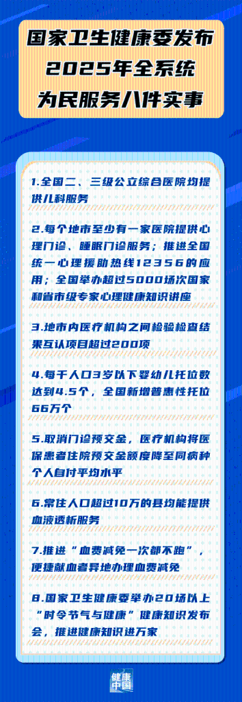 國家衛(wèi)生健康委31日發(fā)布2025年全系統(tǒng)為民服務(wù)八件實事,包括: