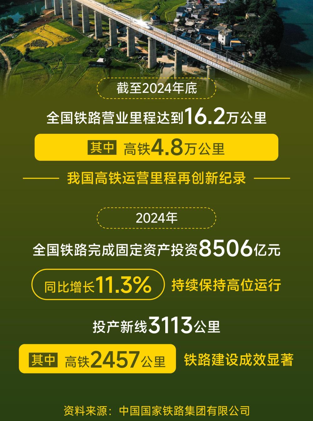 截至2024年底,全國鐵路營業(yè)里程達(dá)到16.2萬公里,其中高鐵4.8萬公里,我國高鐵運(yùn)營里程再創(chuàng)新紀(jì)錄。
