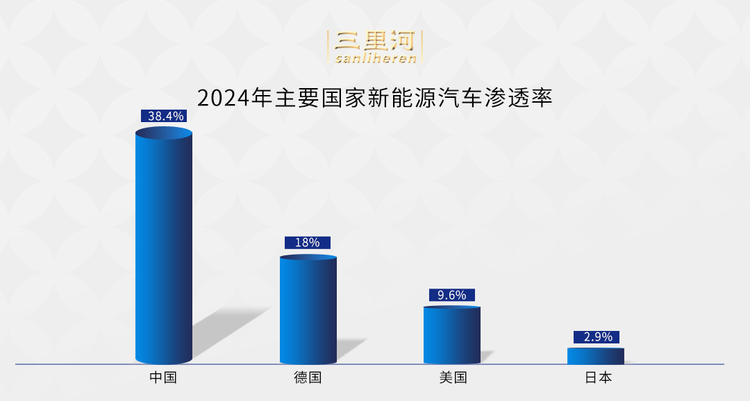 崔東樹提供的數(shù)據(jù)顯示,2024年,中國新能源汽車滲透率達到38.4%,德國達到18%,美國僅有9.6%,日本僅有約3%。世界汽車產(chǎn)業(yè)格局正發(fā)生變化。