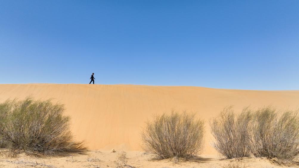 2024年4月11日,一名治沙人行走在達拉特旗境內(nèi)的庫布其沙漠里(無人機照片)。新華社記者 貝赫 攝