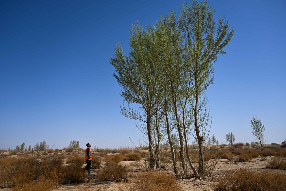 2024年4月11日,一名治沙人在達拉特旗境內(nèi)的庫布其沙漠里巡護樹木。新華社記者 李志鵬 攝