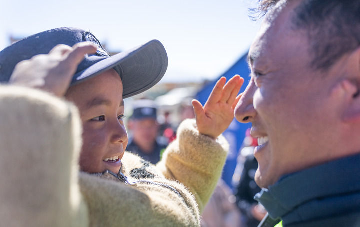 2025年1月14日,在西藏定日縣長(zhǎng)所鄉(xiāng)嘎布村,一個(gè)孩子戴上移民管理警察米瑪次仁的帽子敬禮。新華社記者 丁增尼達(dá) 攝