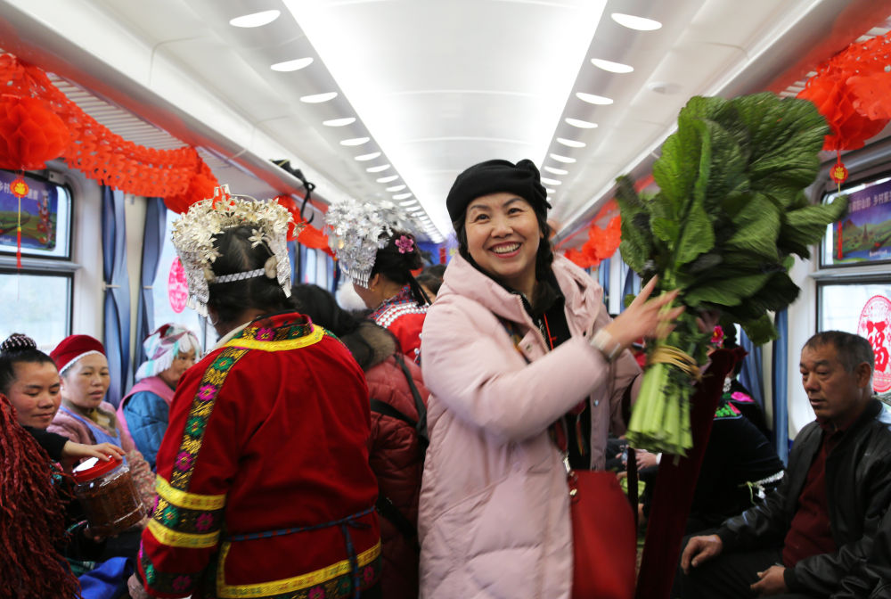 1月18日,在5640次列車上,乘客在“鄉(xiāng)村集市”車廂購(gòu)買蔬菜。新華社發(fā)(余天英 攝)