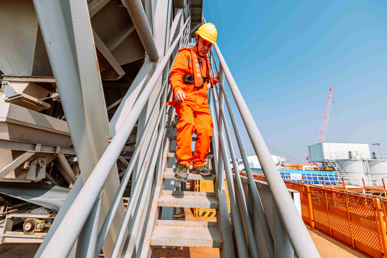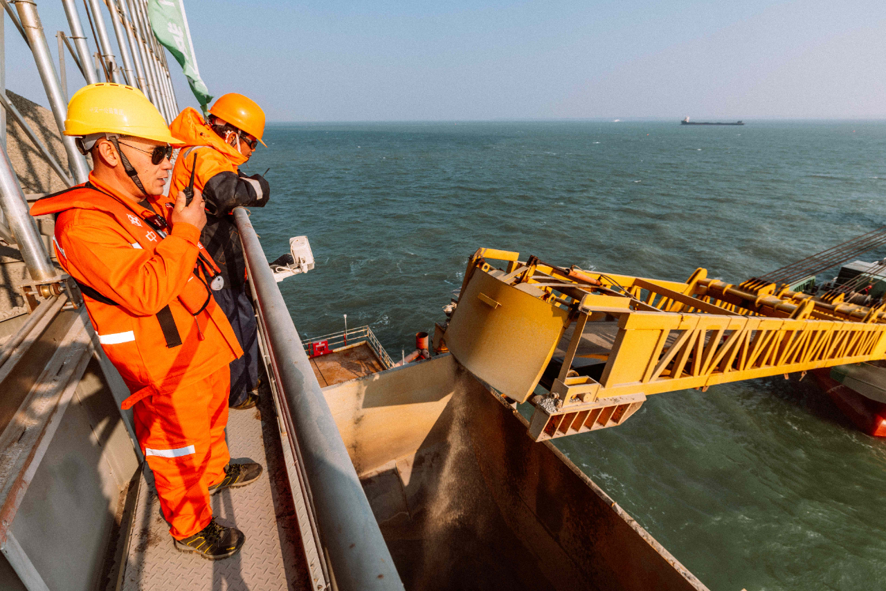 1月17日,夕陽(yáng)下的廈門劉五店港區(qū),北風(fēng)勁吹。在距離中交一公局集團(tuán)廈金大橋(廈門段)項(xiàng)目海上平臺(tái)混凝土操作員梁芝敬站立位置不到30米的洋面上,一艘船身印有“帆順168”字樣的補(bǔ)料船,裝載著4000多噸砂石緩緩抵近。船頭前方延伸出一條25米長(zhǎng)的傳送皮帶,將船上的砂料源源不斷地送抵老梁眼前的鋼制固料斗內(nèi)。當(dāng)天他們要趁著海水退潮帶來(lái)的作業(yè)窗口,為站里補(bǔ)上700噸機(jī)制砂和900噸粒徑10到20毫米的小石子,以確?;炷琳旧a(chǎn)不停機(jī)。