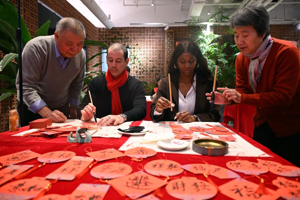 1月17日,外國人在大聯(lián)歡活動中體驗(yàn)書法。當(dāng)日,“春暖朝陽·巳巳如意”中外居民大聯(lián)歡新時(shí)代文明實(shí)踐活動在北京朝陽區(qū)左家莊街道舉行。新華社記者 金良快 攝