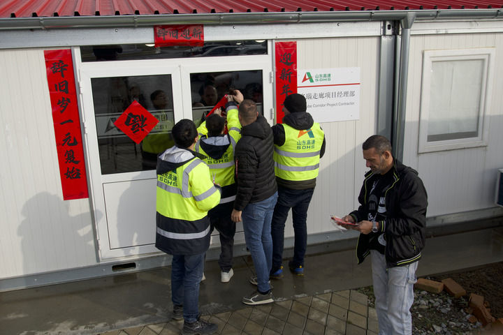 春節(jié)前夕,在塞爾維亞“多瑙走廊”快速路項目營地上,中方工作人員與塞籍員工一起貼福字。新華社發(fā)(內(nèi)馬尼亞攝)