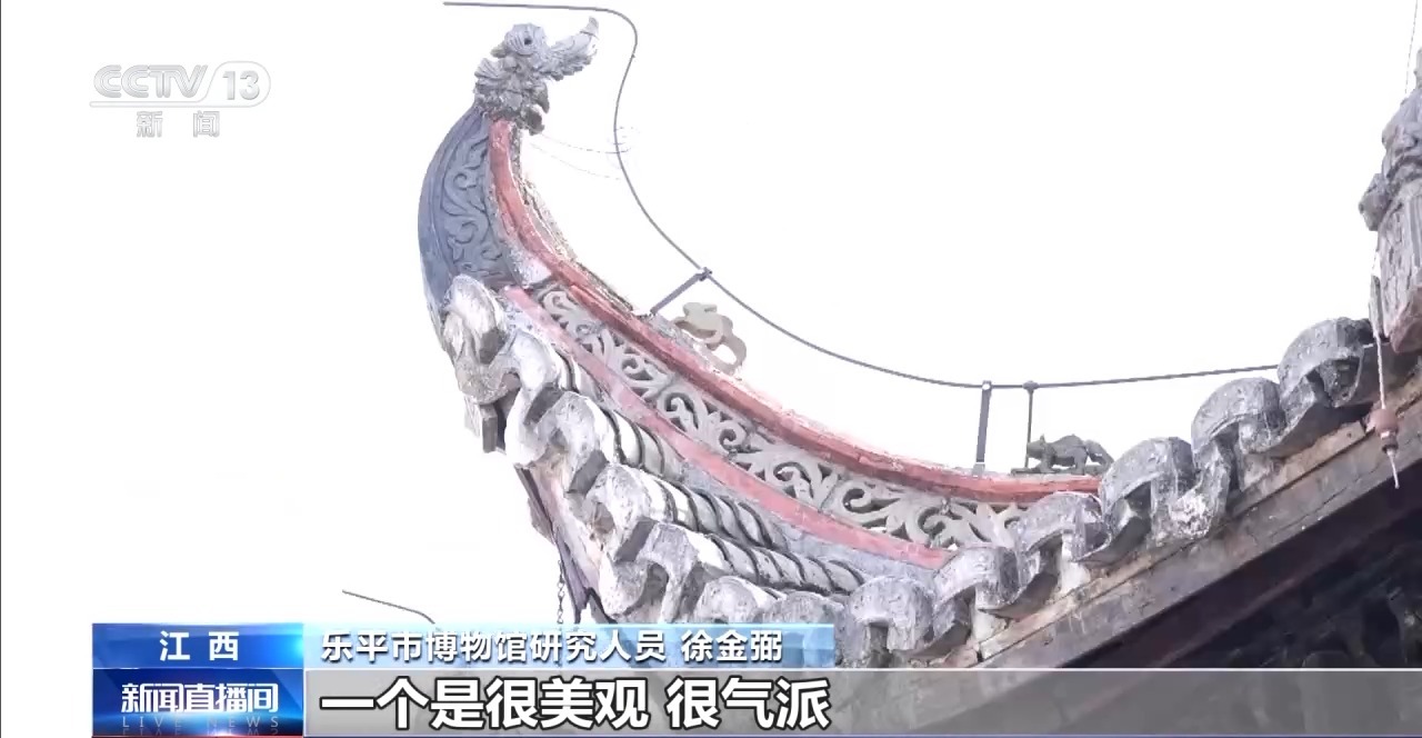 樂平市博物館研究人員 徐金弼:寶頂在古建筑里面一般都有,一個是很美觀、很氣派。它可以避雷,起保護古建筑作用。戲臺翹角,它有兩個功能,一個防水,一個采光,氣勢恢宏。