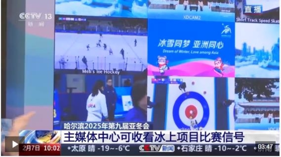 通過現(xiàn)場的大屏可以看到正在進(jìn)行的比賽,大屏在賽時可提供所有冰上場館的9路信號,來自不同國家和地區(qū)的媒體記者可以根據(jù)自己的需求來選擇不同比賽場次信號來關(guān)注。