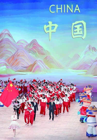 當中國代表團入場時,體育健兒揮手致意,現場觀眾起立鼓掌。在本屆亞冬會上,中國代表團將參加全部項目的比賽,并朝著“取得我國亞冬會參賽史上最好成績”的目標全力進發(fā)。