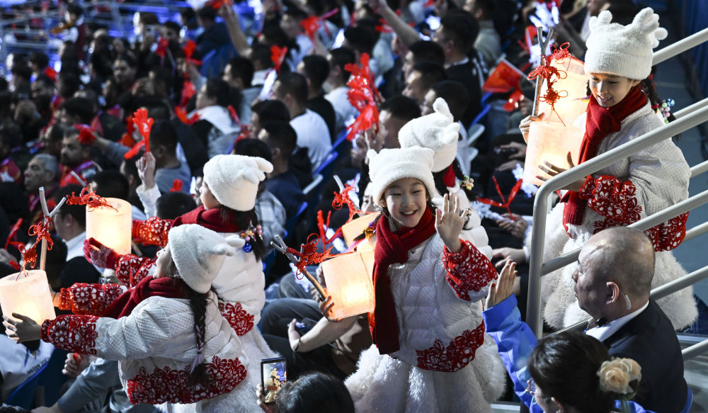當晚,在開幕式分會場冰雪大世界,手提冰燈的孩子們來到占地百萬平方米的園區(qū),與冠軍火炬手一同滑行,見證主火炬點燃。