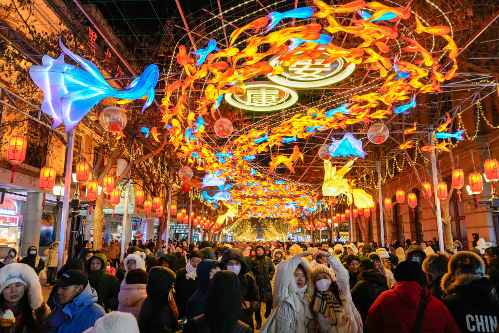 2025年1月30日,游客在哈爾濱中央大街上游玩、拍照。