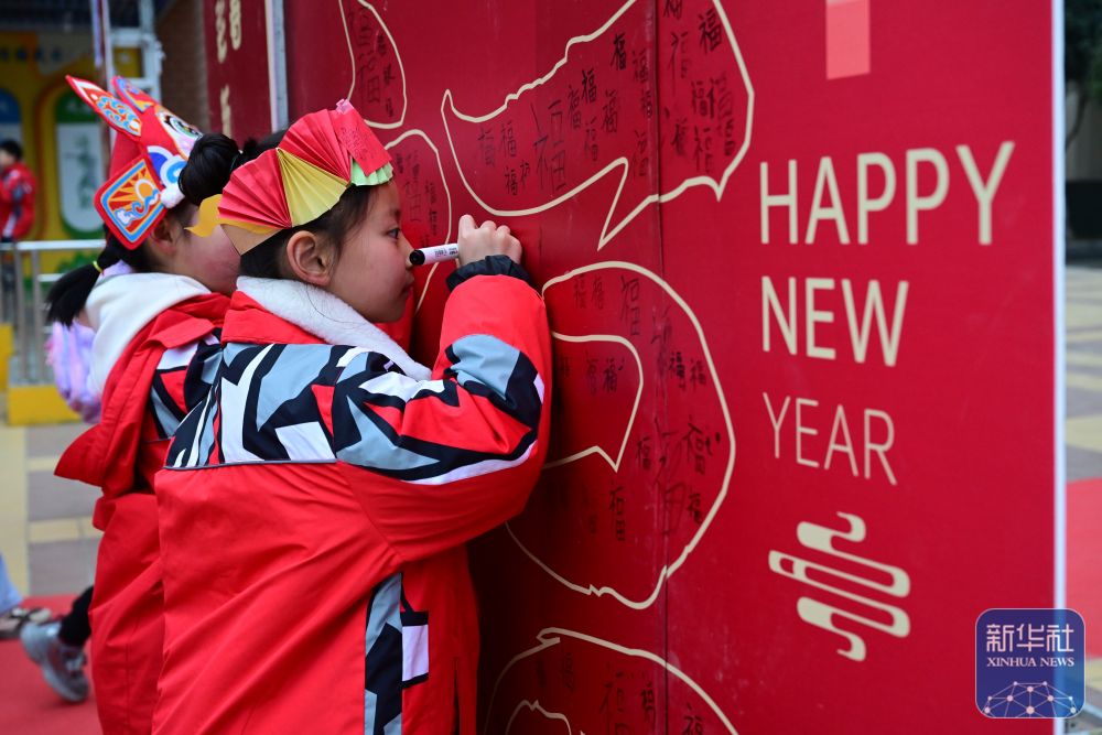 2月14日,在合肥市園上園小學(xué)喻崗分校,學(xué)生參加畫蛇添“?!被顒?。新華社記者 周牧 攝