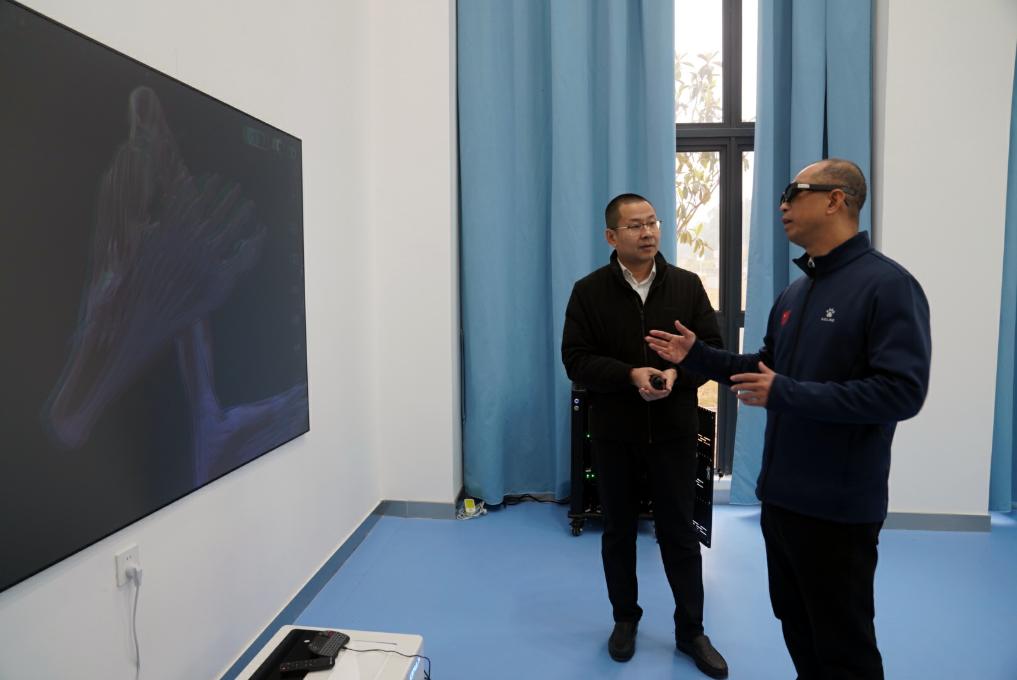2月17日,在廣西體育高等??茖W(xué)校,韋軍與運動健康學(xué)院的老師交流,了解3D模擬運動解剖模型如何助力教學(xué)。新華社記者 陳露緣 攝