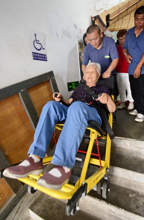 2024年7月11日,北京市朝陽(yáng)區(qū)青年路社區(qū)一老舊小區(qū)居民在樓內(nèi)體驗(yàn)“爬樓機(jī)”。新華社記者 李欣 攝