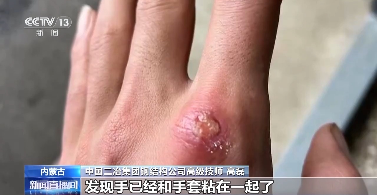 中國二冶集團(tuán)鋼結(jié)構(gòu)公司高級技師 高磊:如果你中途停止的話,再重新起弧就可能造成焊接缺陷,我就沒有選擇停,我就咬著牙堅持把這段焊縫完成,直到焊到最后,等我往下摘我的焊工手套的時候,發(fā)現(xiàn)手已經(jīng)和手套粘在一起了,燙出特別大一個水泡。