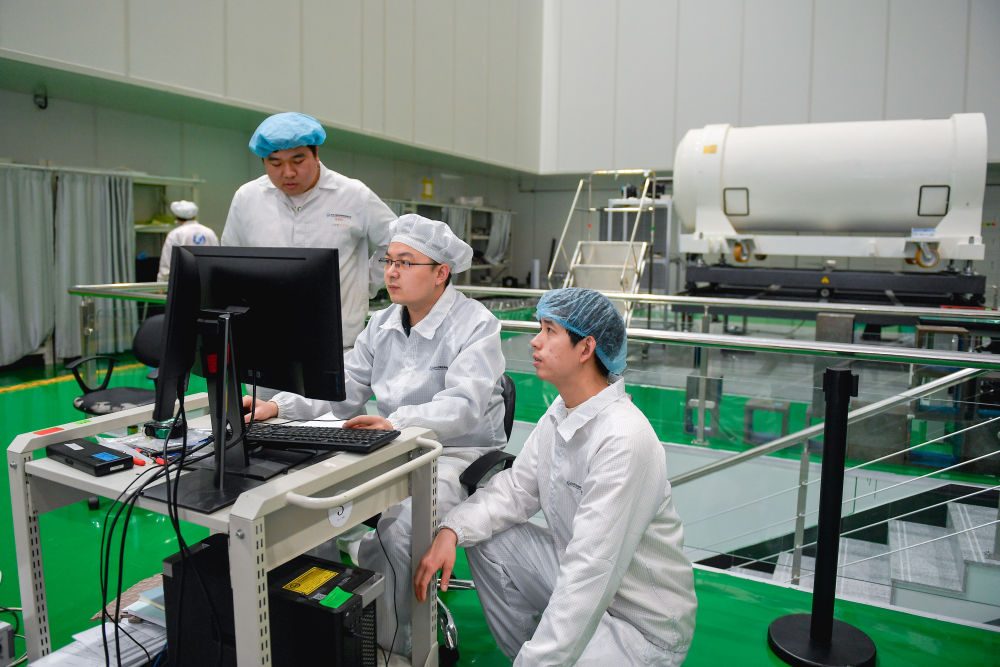 在長(zhǎng)光衛(wèi)星相機(jī)裝調(diào)間,王升(右二)在調(diào)試衛(wèi)星光學(xué)遙感載荷組件時(shí)與團(tuán)隊(duì)成員討論細(xì)節(jié)。