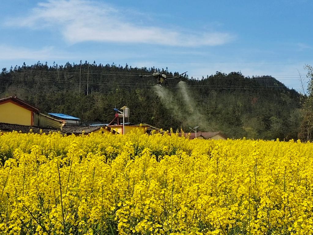 眼下,西部多地油菜進入盛花期,做好田間管理尤為重要。在云南省馬關(guān)縣夾寒箐鎮(zhèn)上布高村,縣農(nóng)業(yè)農(nóng)村和科學(xué)技術(shù)局高級農(nóng)藝師李明兵和同事正操作著植保無人機,沿著設(shè)定路線進行飛防作業(yè)。無人機噴灑出霧狀農(nóng)藥,為1500余畝金色的油菜花海布下一道科技感十足的“防護簾”。