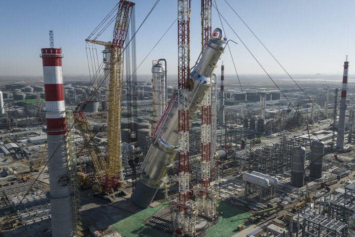 2月26日拍攝的華錦阿美精細化工及原料工程項目芳烴聯(lián)合裝置抽余液塔吊裝施工現(xiàn)場(無人機照片)。 新華社記者 潘昱龍 攝