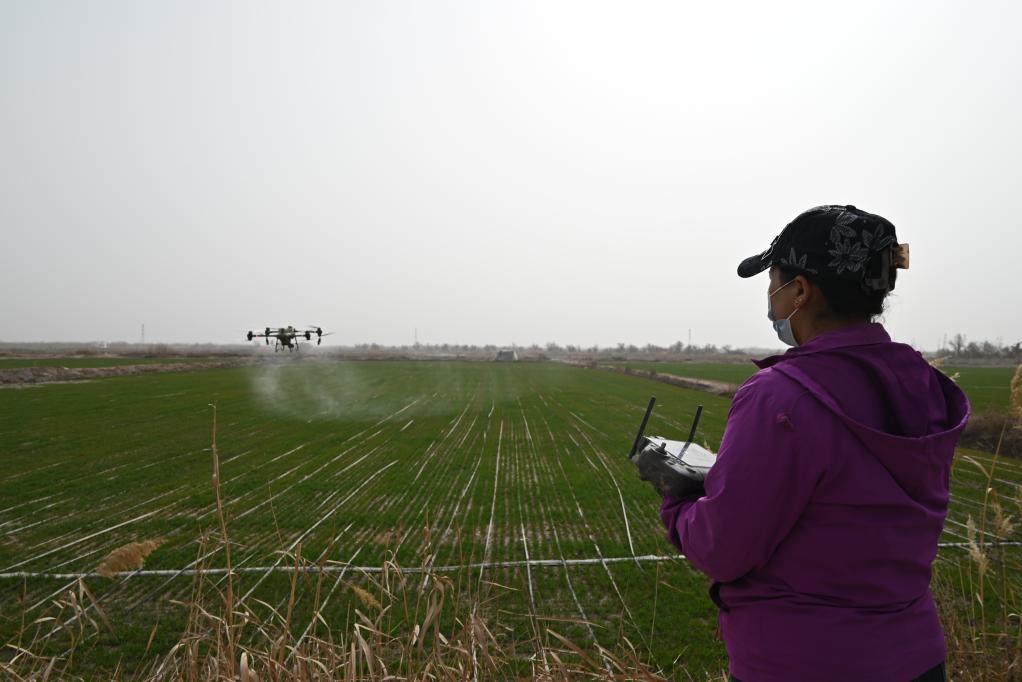 3月18日,在新疆喀什地區(qū)英吉沙縣一麥田,努日曼古麗正在操作無人機(jī)。新華社記者 尹茹紅 攝
