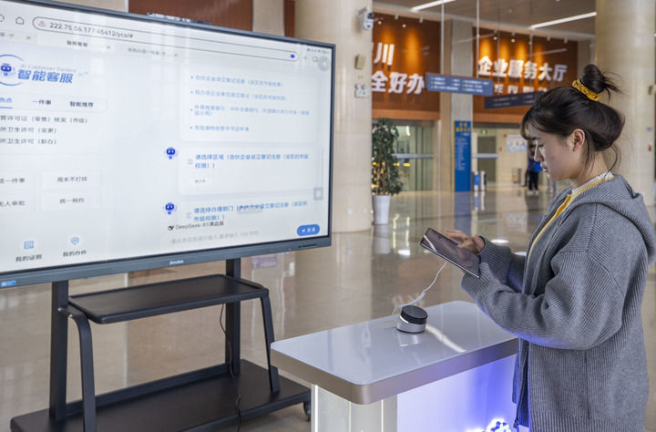 3月21日,辦事人員在銀川市審批服務管理局企業(yè)服務大廳使用智能客服查詢信息。新華社記者 楊植森 攝