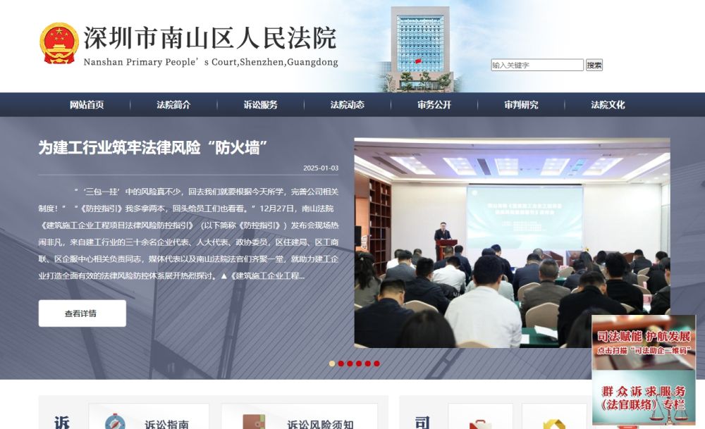 登錄南山法院官網,一個“司法賦能 護航發(fā)展”浮窗引人注目,點擊進去,就出現(xiàn)一個“司法助企二維碼”。企業(yè)只需一掃,就可以線上反映多元解紛、普法需求、意見建議、信訪投訴等司法需求。