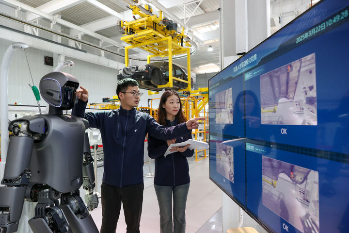 3月22日,在位于江蘇無錫的天奇股份人形機器人數(shù)據采集實訓基地,工程師在調試人形機器人。新華社發(fā)(朱吉鵬攝)