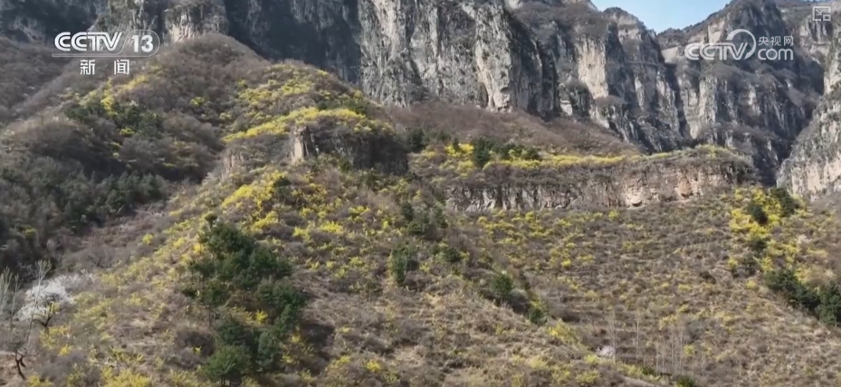 在新鄉(xiāng)輝縣市南太行萬仙山景區(qū),海拔1300米的山腰上,三五成簇的連翹花盛開在崖壁、山坡和溝谷當中,為巍峨的太行山披上一身“黃金甲”。淡雅的黃色花瓣在溫柔的春光里隨風舞動、芳香四溢,游客們在山巒花海中感受濃濃春意。