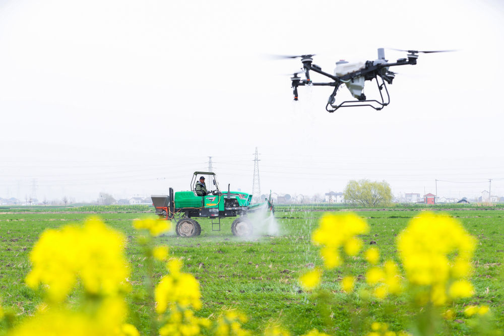 近日,在江蘇省興化市陳堡鎮(zhèn)蔣莊村,農(nóng)民駕駛植保無人機(jī)、自走式噴桿噴霧機(jī)實(shí)施雜草防治作業(yè)。 新華社發(fā)(周社根 攝)