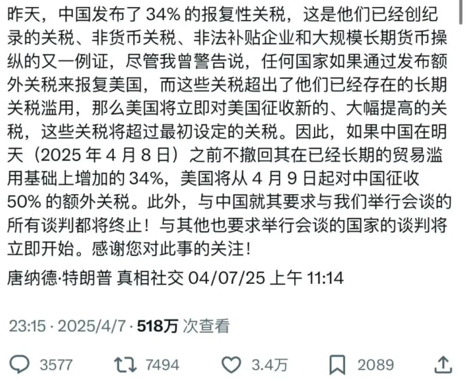 一覺醒來,特朗普再發(fā)威脅,警告中國在4月8號前取消報復(fù),不然4月9號就對中國再加50%額外關(guān)稅,此外所有和中國的談判都會中止,而和其他國家的談判將立即開始。