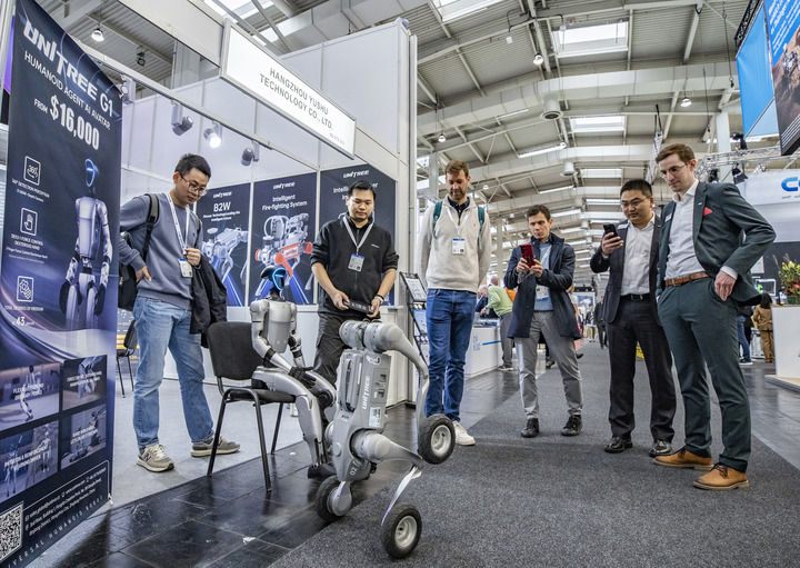 2025年4月1日,在德國漢諾威工業(yè)博覽會(huì)上,人們?cè)谟顦淇萍颊箙^(qū)觀看機(jī)器狗演示。新華社記者 張帆 攝