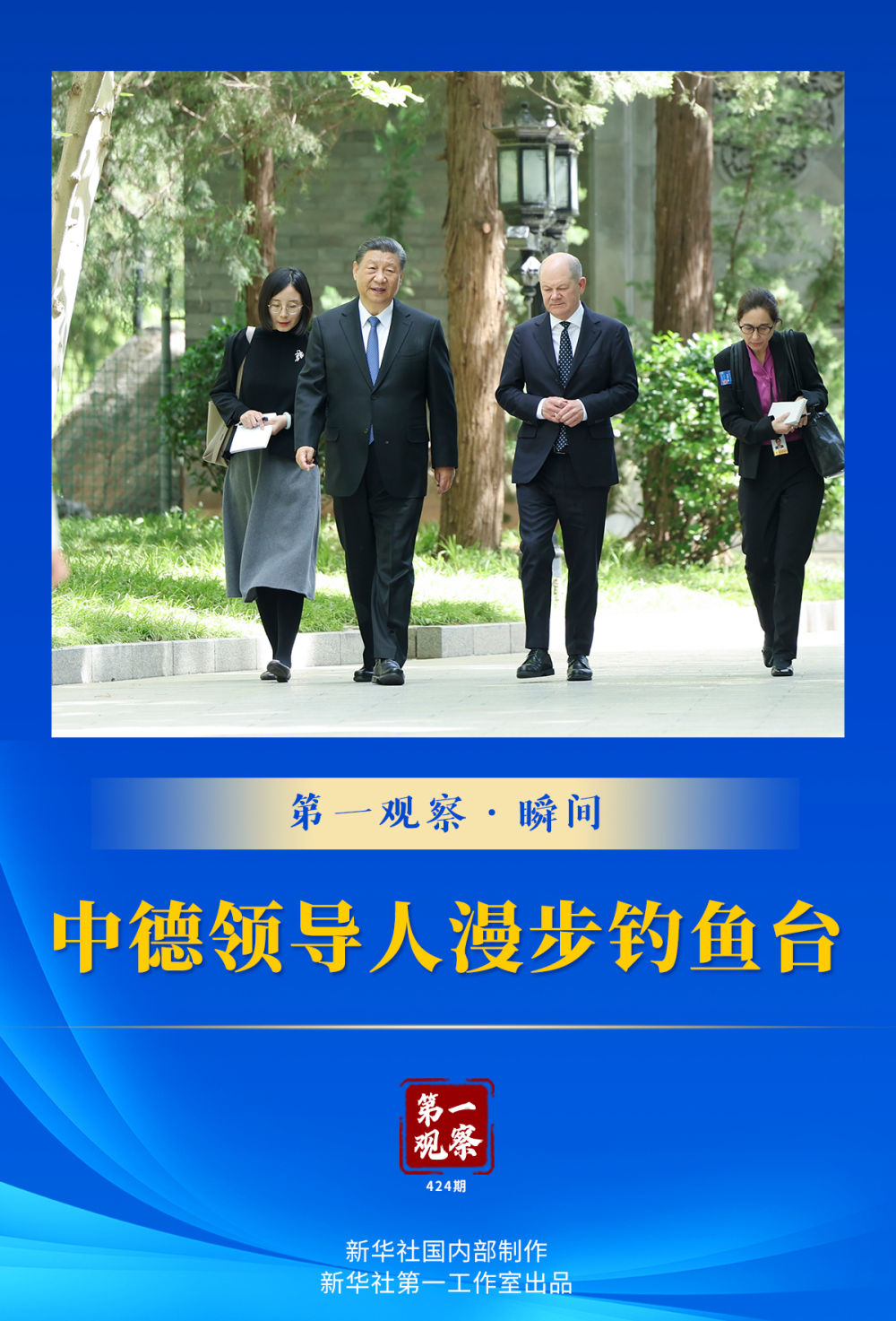 新華社記者的鏡頭,記錄下中德兩國領(lǐng)導(dǎo)人一起散步交流的畫面——