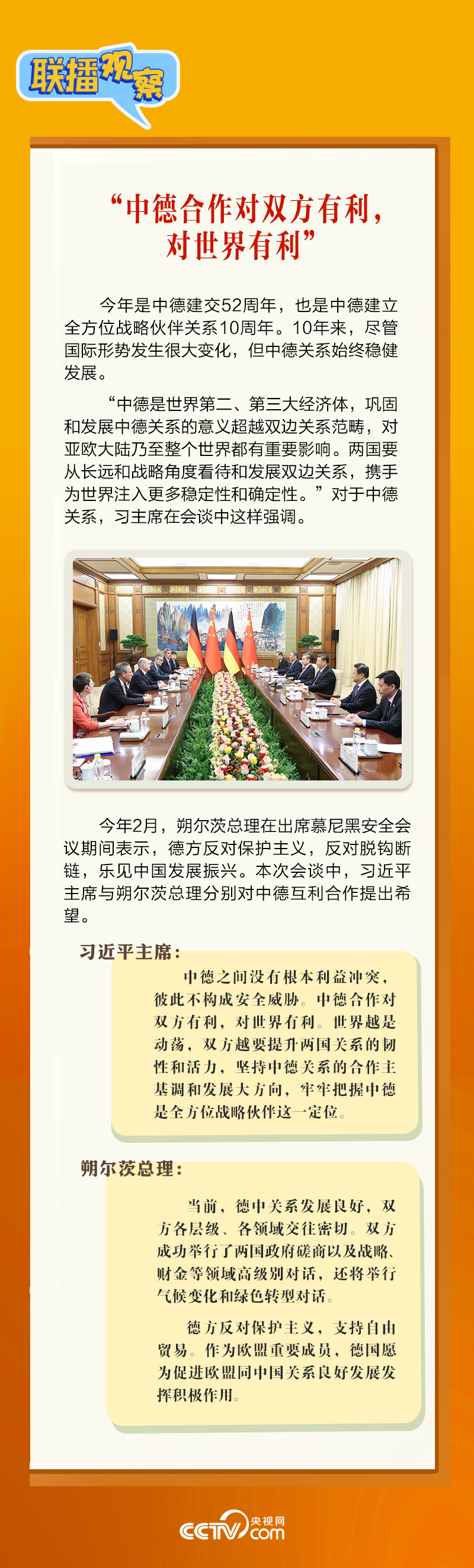 4月16日上午,習近平主席在北京釣魚臺國賓館會見朔爾茨總理。會見中,習主席強調,要“牢牢把握中德是全方位戰(zhàn)略伙伴這一定位”。中德建立全方位戰(zhàn)略伙伴關系10年來,兩國如何共同發(fā)展,相互成就?央視網《聯播觀察》帶您了解。