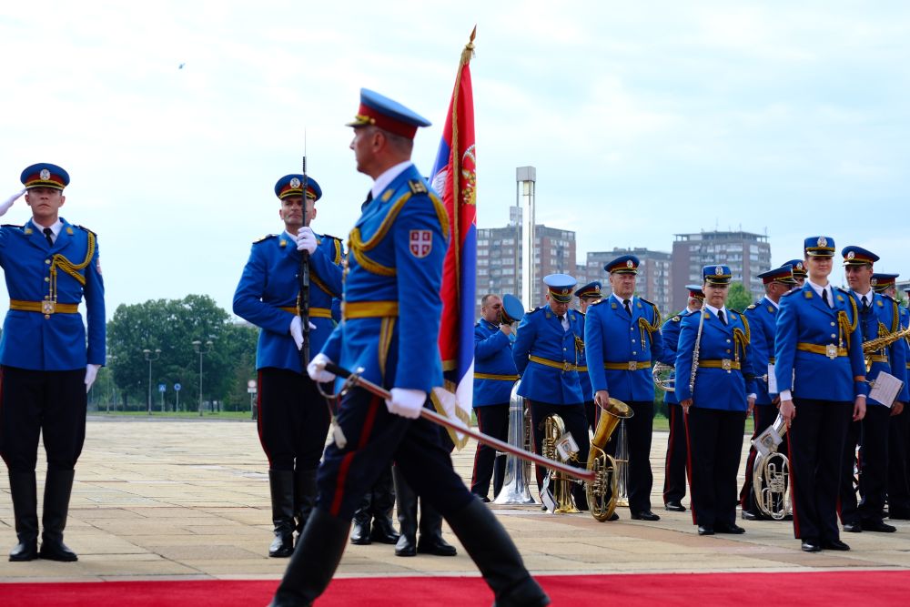 塞爾維亞大廈前,中塞兩國國旗迎風(fēng)飄揚(yáng),儀仗隊威武雄壯。