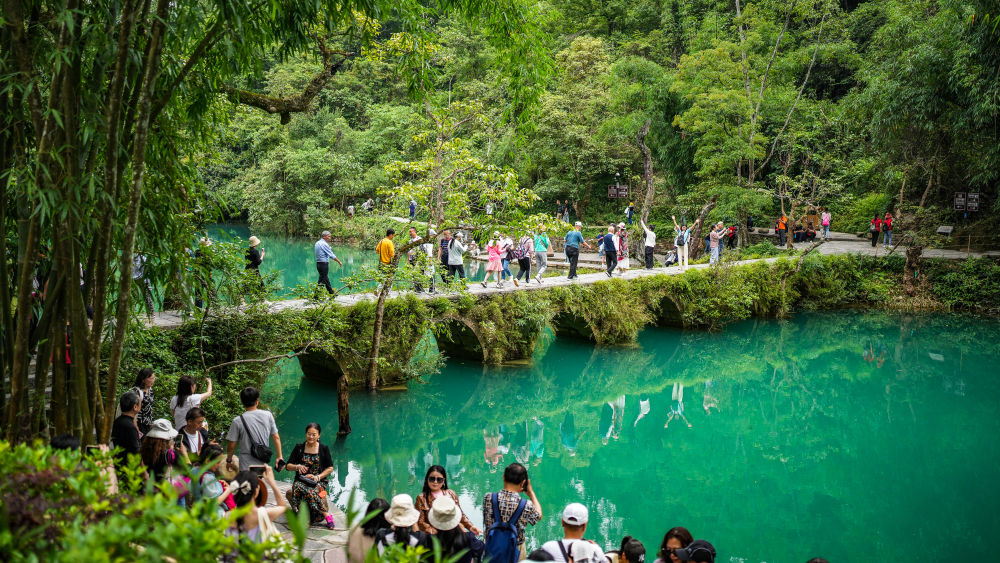 初夏時(shí)節(jié),貴州省黔南布依族苗族自治州荔波縣小七孔景區(qū)綠意盎然、風(fēng)光秀美,吸引眾多游客前來觀光游玩。新華社記者 陶亮 攝
