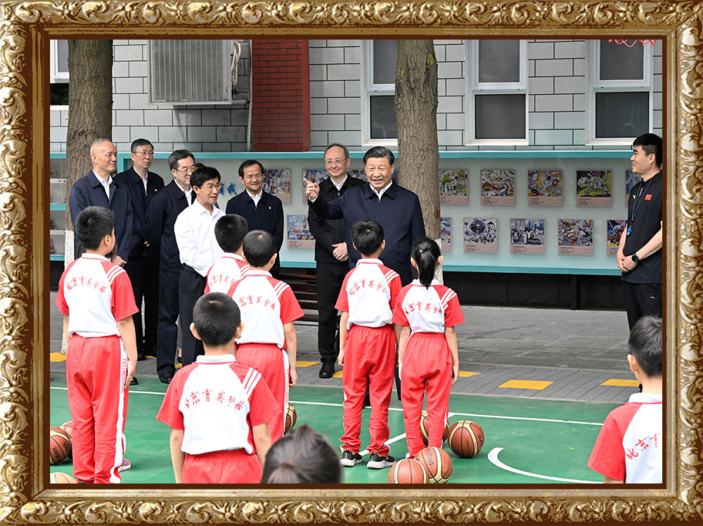 2023年5月31日上午,習(xí)近平總書記來到北京育英學(xué)??赐繂枎熒诨@球場同正在上體育課的小學(xué)生們親切交流。習(xí)近平親切地說:“現(xiàn)在生活條件好了,孩子們不是要吃得胖胖的,而是要長得壯壯的、練得棒棒的。”