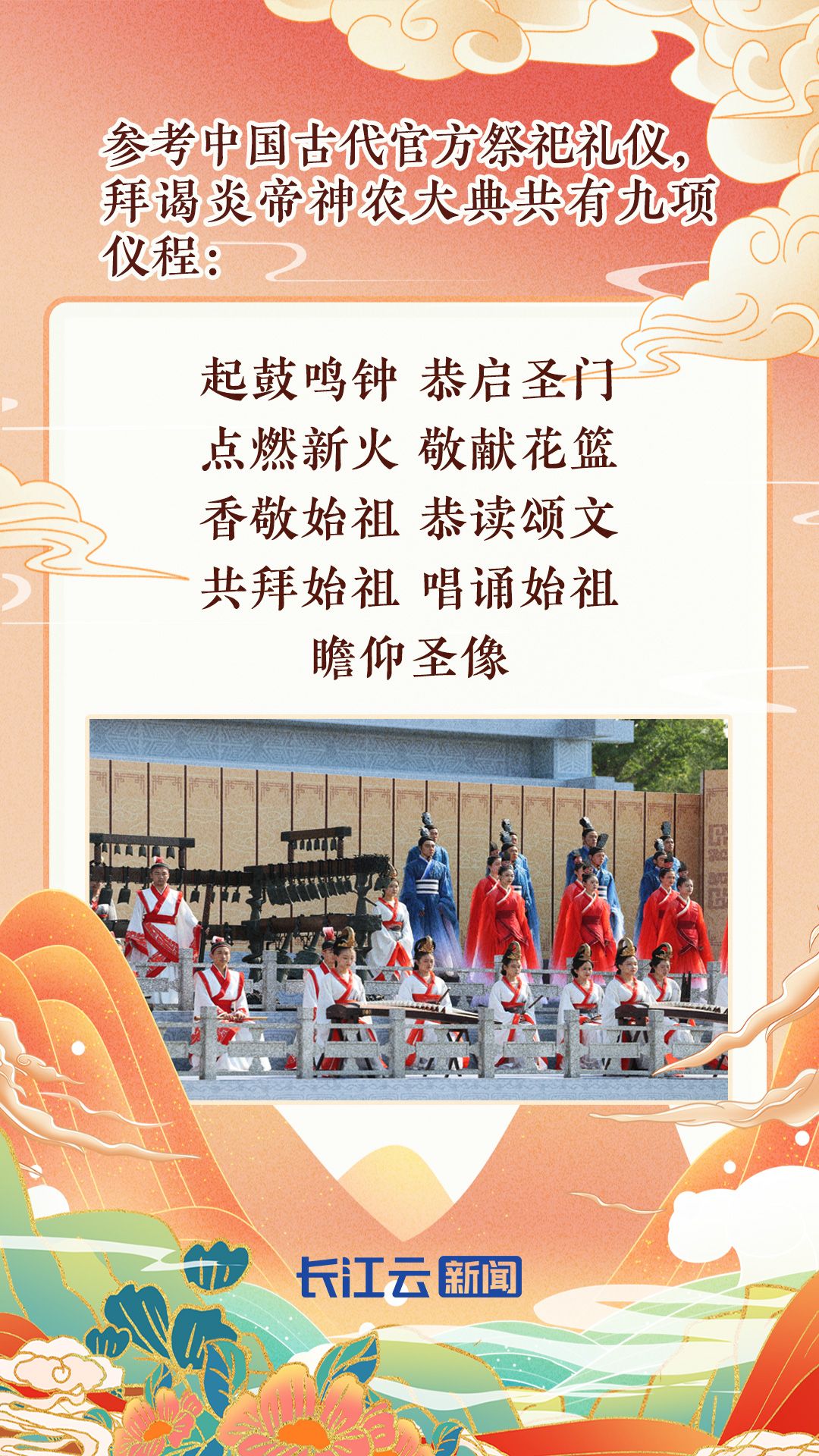 在儀式流程方面,設計有:起鼓鳴鐘、恭啟圣門、點燃新火、敬獻花籃、香敬始祖、恭讀頌文、共拜始祖、唱誦始祖、瞻仰圣像等九項儀程,充分融入了炎帝文化、荊楚文化、曾隨文化的元素;