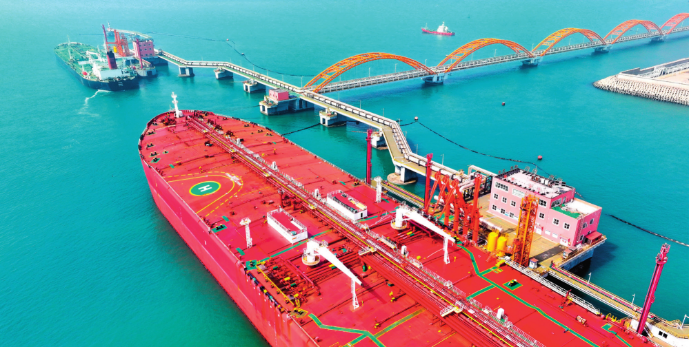 在山東港口日照港嵐山港區(qū)30 萬噸級(jí)油品碼頭,船舶停靠進(jìn)行卸油作業(yè)(2024年3月29日攝)郭緒雷攝 / 本刊