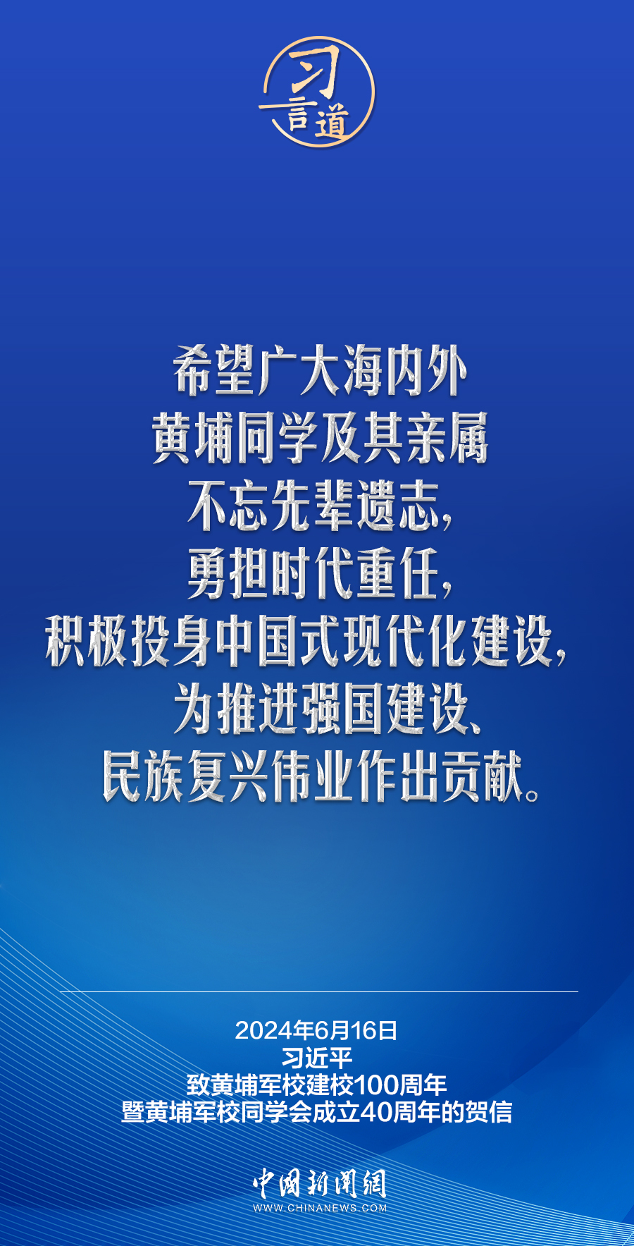 在黃埔軍校建校100周年暨黃埔軍校同學(xué)會(huì)成立40周年之際,中共中央總書記、國(guó)家主席、中央軍委主席習(xí)近平發(fā)來賀信,代表中共中央向黃埔軍校同學(xué)會(huì)表示熱烈祝賀,向廣大海內(nèi)外黃埔同學(xué)及其親屬致以誠(chéng)摯問候。習(xí)近平指出——