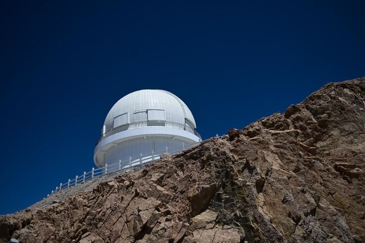 這是在青海省海西蒙古族藏族自治州茫崖市冷湖鎮(zhèn)賽什騰山拍攝的中國科學(xué)技術(shù)大學(xué)和中國科學(xué)院紫金山天文臺(tái)聯(lián)合研制的大視場光學(xué)成像望遠(yuǎn)鏡——墨子巡天望遠(yuǎn)鏡(2024年4月20日攝)。