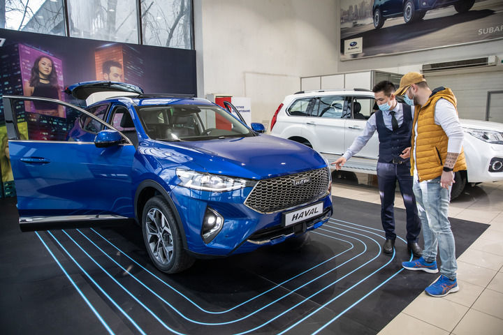 2021年4月1日,銷售人員在哈薩克斯坦阿拉木圖市經(jīng)銷商店向消費(fèi)者介紹哈弗汽車。