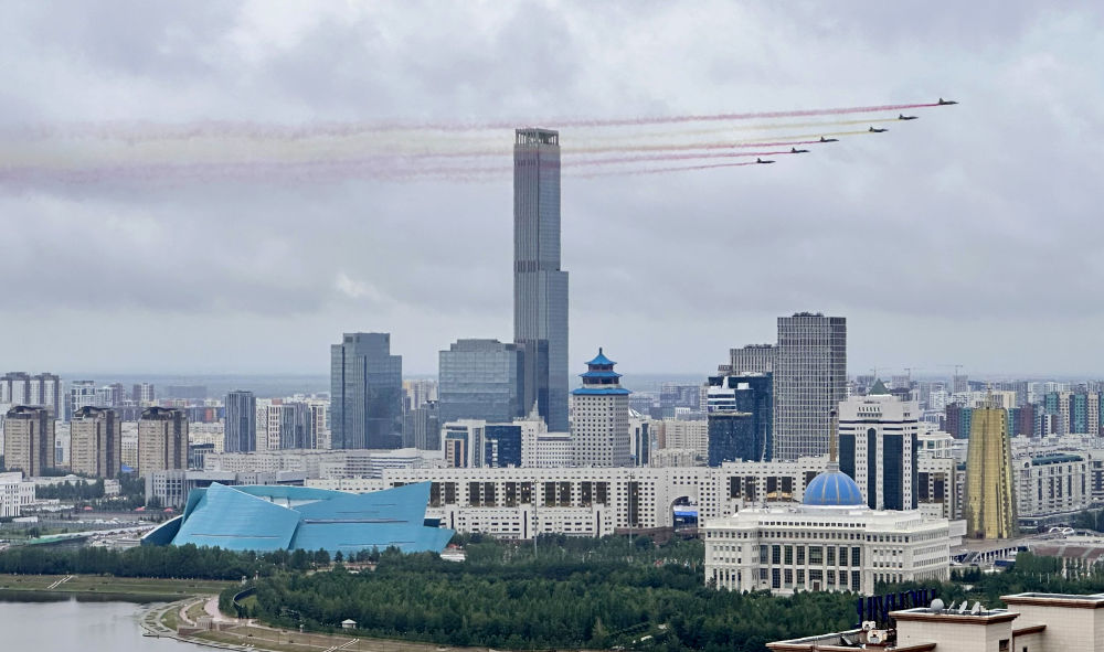 當(dāng)?shù)貢r間7月3日,國家主席習(xí)近平在阿斯塔納出席哈薩克斯坦總統(tǒng)托卡耶夫舉行的歡迎儀式。習(xí)近平乘車抵達(dá)總統(tǒng)府時,托卡耶夫總統(tǒng)熱情迎接。六架哈薩克斯坦空軍戰(zhàn)機(jī)從總統(tǒng)府上空飛過,拉出象征中國國旗的紅黃色彩煙,以最高禮儀歡迎習(xí)近平對哈薩克斯坦進(jìn)行國事訪問。