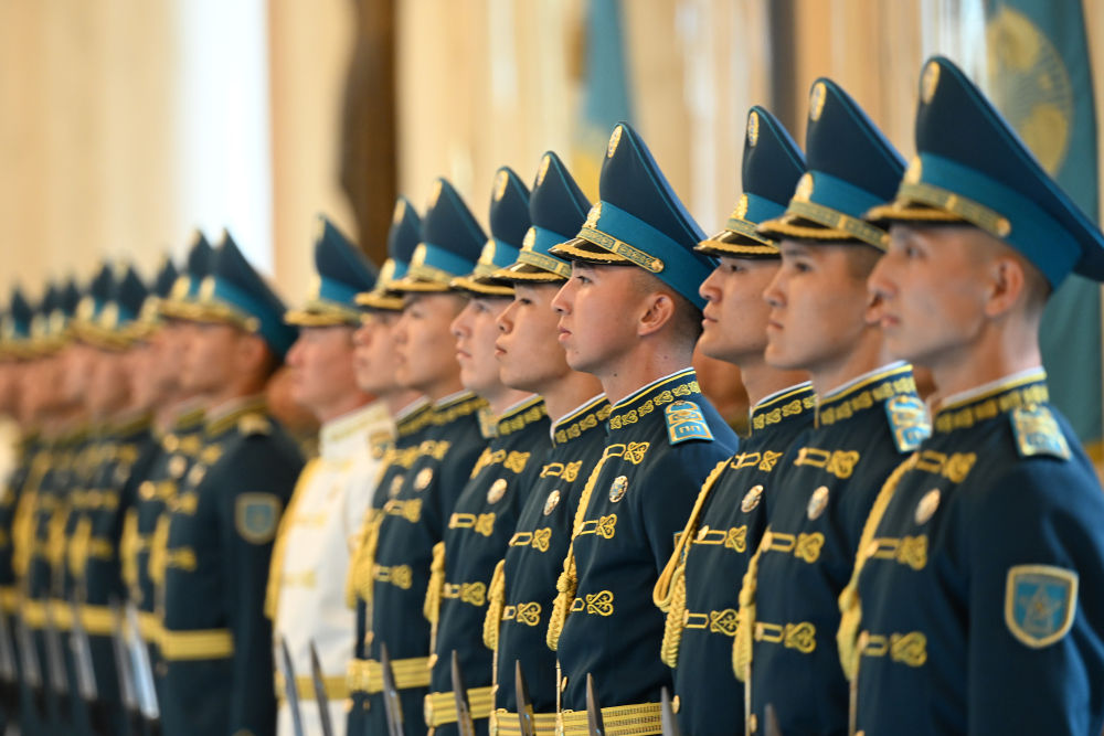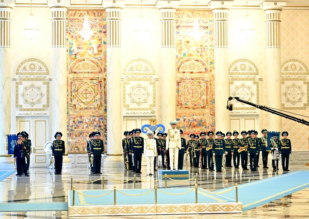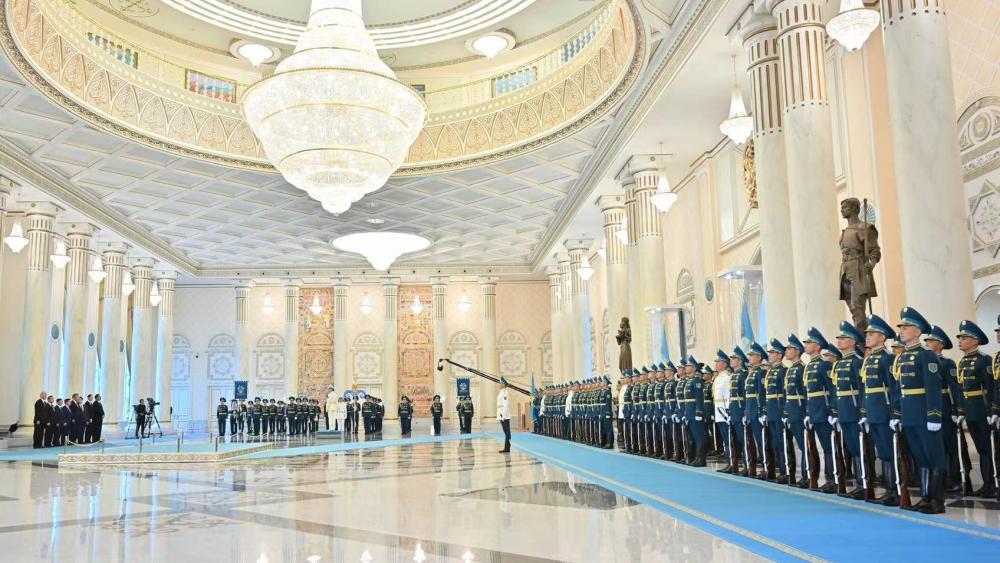 托卡耶夫為習(xí)近平舉行隆重歡迎儀式。總統(tǒng)府大廳氣勢恢宏,禮兵威武挺拔。兩國元首分別同對方陪同人員一一握手致意。兩國元首登上檢閱臺,軍樂團(tuán)奏中哈兩國國歌。習(xí)近平在托卡耶夫陪同下檢閱儀仗隊。