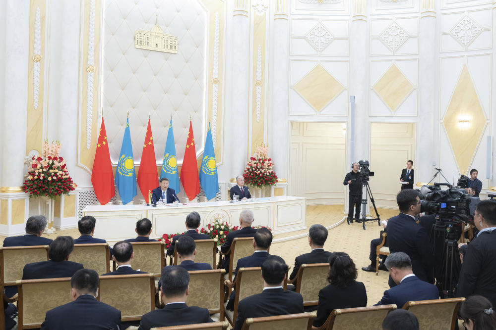習(xí)近平在阿斯塔納總統(tǒng)府同托卡耶夫共同會見記者。