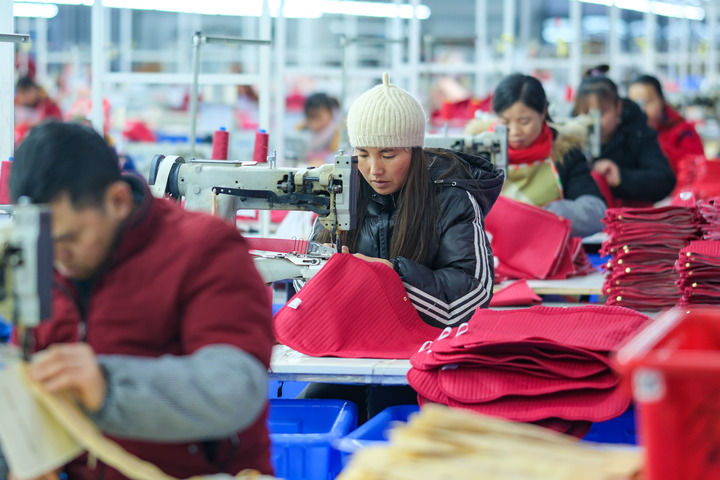 2024年1月18日,社區(qū)居民在紅安社區(qū)的鄉(xiāng)村振興就業(yè)車間工作。紅安社區(qū)是由易地搬遷安置區(qū)單獨成立的新社區(qū),位于湖南省湘西土家族苗族自治州鳳凰縣禾庫鎮(zhèn)。