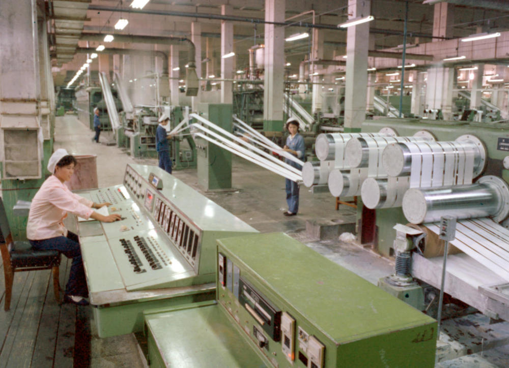 1981年,東北遼陽(yáng)石油化學(xué)纖維廠抽絲車間一角。新華社發(fā)