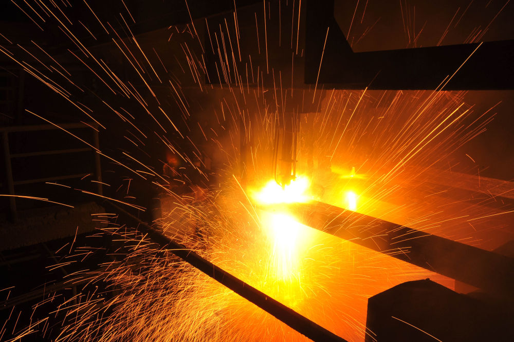 2015年3月10日,東北特鋼集團(tuán)大連基地生產(chǎn)的合金鋼連鑄坯進(jìn)行定尺切割。新華社發(fā)